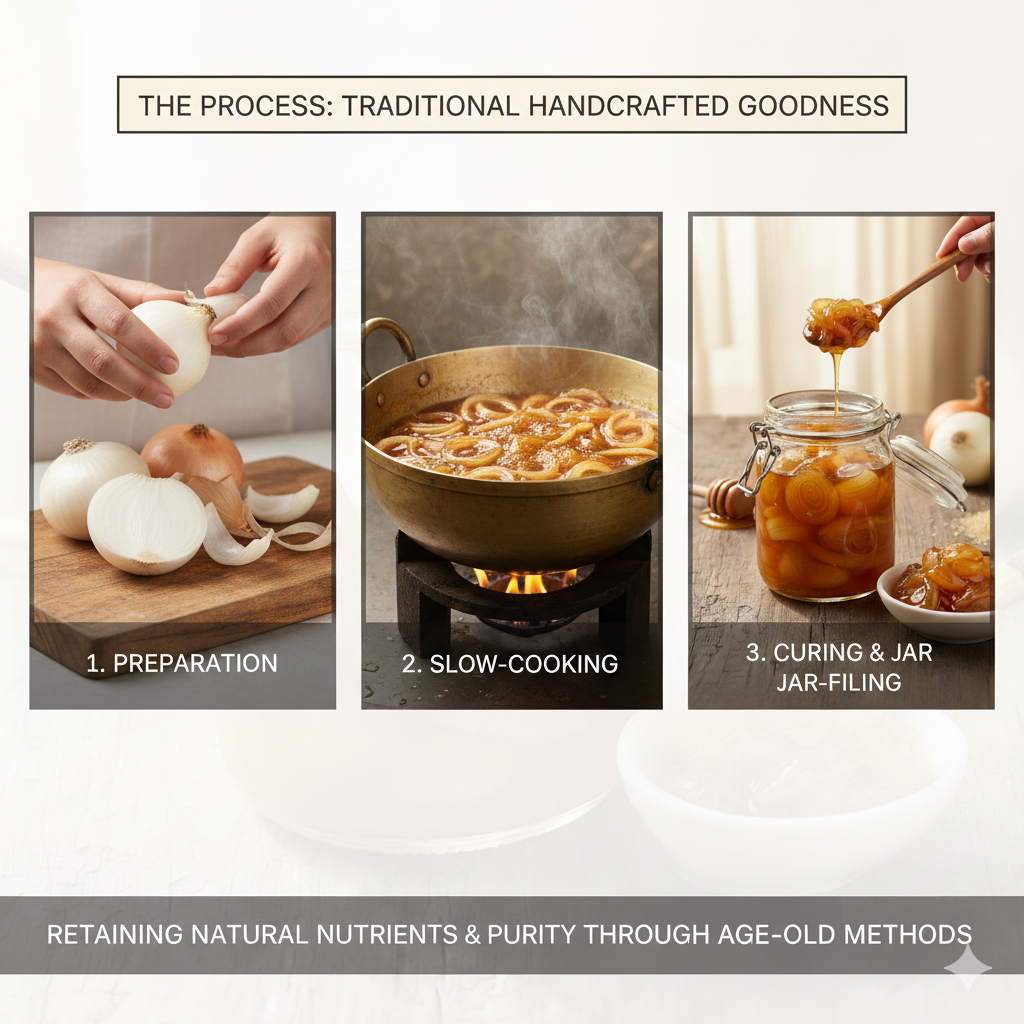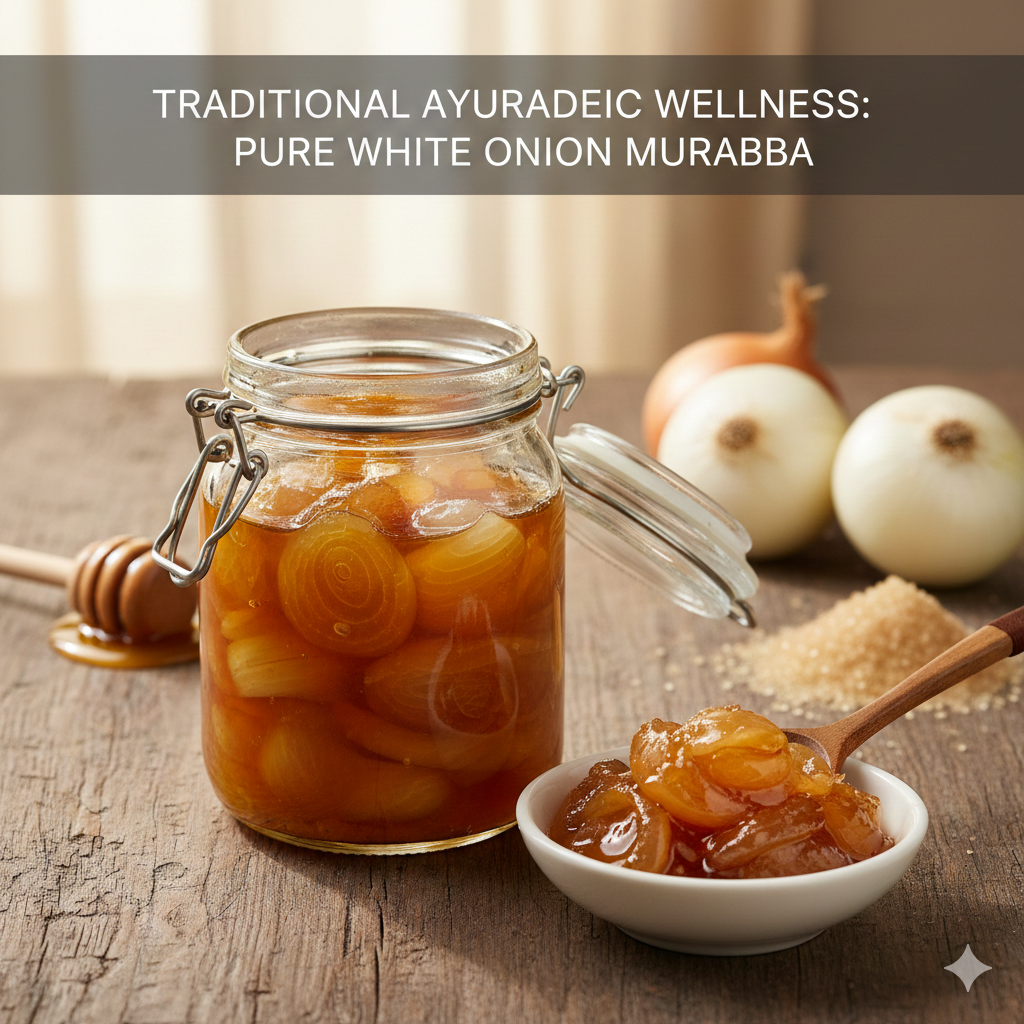 White Onion Murabba (also known as Safed Pyaj ka Murabba) is a traditional Ayurvedic preserve made by slow-cooking fresh white onions in a sweet base, typically honey or sugar syrup. Unlike red onions, white onions are milder and have a higher sugar content, making them ideal for a sweet, jam-like preserve that serves as both a delicacy and a health tonic.